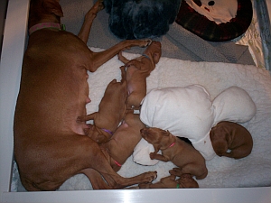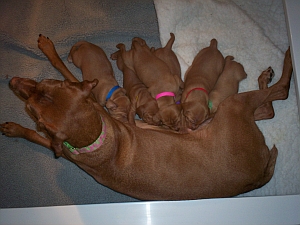 Winston, please stay off the fence - it is like an earthquake when you jump up and you scare me and my puppies!!! |  |  Breakfast of Champions at 4 days old! |