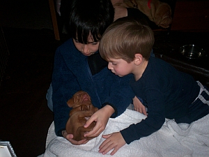 Very hungry after a day at the vet! Our tails are shorter! :-( |  |  Keeping warm at 4 days old! |
