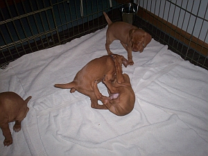 Pink Girl (red collar) and Red Boy! Six weeks old! |  |  Wrestling! |
