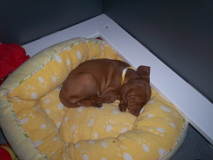 Chewing Purple Girl! "My Mommie, Jolie, taught me this!" |  |  This is our cool new house! We have crates and more toys and soft beds! Lots more room to play (and to go potty)! Green Boy did the "zoomies", running everywhere, he was so excited! |