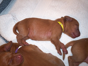 Dinner time at three weeks old! |  |  Yellow Girl the tail-biter! |
