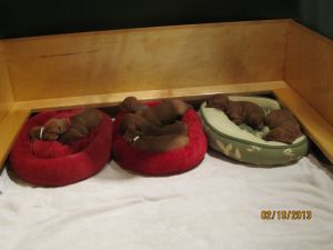 Denni and Kinzy home in the new whelping box! |  |  Kinzy snuggling withsweet Red Boy! |
