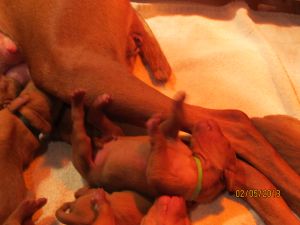 Yello Girl and others nursing on Day 4 |  |  Sweet Green Boy Puppy - they love to lay across Kinzy's neck! |